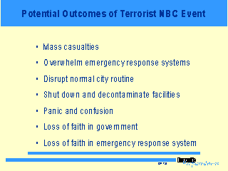 - A well planned and executed terrorist NBC attack may result in thousands of casualties, many of whom can carry residual contamination on their clothing. A similar event using biological agents could result in the infection of tens of thousands. - The presence of NBC agents in a terrorist act will overwhelm all factions of the emergency response system; medical, fire, police, HAZMAT teams, communications, support and clean-up will be most heavily burdened. - The immediate area will have to be evacuated, tying up traffic and shutting down facilities for prolonged periods of time. - Fear leads to widespread panic, which can result in the public losing faith in the ability of the government to protect their safety and welfare. |