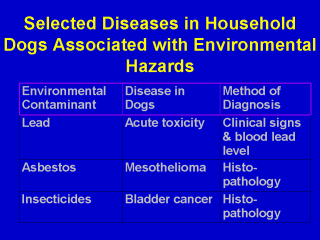 1) A veterinary sentinel event is defined as a disease or condition in animals that, because of recognized characteristics known or suspected about their etiology, have particular significance for identifying hazardous concentrations of contaminants in the environment. 2) The three diseases noted in this table have been shown in controlled epidemiological studies to result from specific environmental hazards in the home. Recognition of these events serves as a warning of similar hazards to human inhabitants. 3) These diseases in humans and dogs are also similar in their clinical features and biology. 4) Because the life-span of pet dogs is relatively short compared with humans, the latency period for most chronic diseases in dogs is shorter than for humans. If an environmentally induced disease in an animal is recognized as a sentinel event, there is usually time to take corrective action before a similar disease develops in humans. |