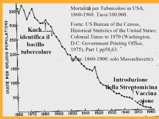 Autore: John Last, Canada http://www.pitt.edu/~super1/lecture/lec2561/007.htm Mortalità per Tubercolosi, 1860-1960, USA. Fonte: US Bureau of the Census, Historical Statictics of the United States; Colonial Times to 1970 (Washington, D.C.:Government Printing Office, 1975), Part 1 pp58,63. I dati dal 1860 al 1900 si riferiscono al solo stato del Massachusetts. Determinanti ambientali delle malattie Nel XIX secolo si è osservata un cambiamento nelle caratteristiche delle malattie, che è ben più che l’effetto diretto del miglioramento delle condizioni igieniche finalizzate alla riduzione della mortalità per infezione: il cambiamento è stato sostenuto attraverso modifiche nei valori e nei comportamenti. La mortalità per tubercolosi cominciò a diminuire all’inizio del XIX secolo e continuò costantemente a calare, ben prima che la scoperta di regimi chemioprofilattici efficaci portasse alla quasi completa sparizione della malattia dai Paesi ricchi, negli anni 50. La prosperità economica migliorò le condizioni abitative e alimentari; la cultura di base si estese; divenne meno frequente la condivisione del letto fra più bambini. Alloggi migliori, alimentazione più adeguata, maggiore informazione e spazio sufficiente a limitare la probabilità della trasmissione diretta di infezioni, tutto giovò a ridurre il carico di morti premature. Probabilmente aumentò anche il livello dell’immunità naturale passiva (da madre a figlio) contro alcune delle malattie che prima portavano via un gran numero di neonati e di bambini, e forse c’è stata anche una riduzione della virulenza di alcuni dei patogeni più letali. |