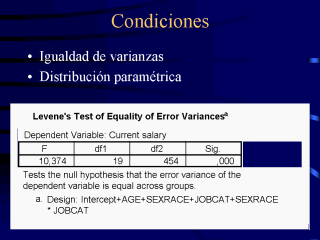 El test de Levene determina si los subgrupos tienen varianzas significativamente distintas entre sí. En tal caso, hay que tener precaución al interpretar los resultados ya que pueden no ser fiables. |
