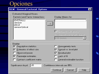 Descriptive: produce medias observadas, desviaciones standard, y recuento N para todas las variables dependientes en todas las celdas o subgrupos formados. Estimates of effect size: Da un valor parcial de eta-cuadrado para cada efecto y cada estimación de parámetro. Este estadistico describe la proporcion de la variabilidad total atribuible al factor, de modo similar a R2 para la regresión. Observed power da la potencia del test cuando la hipotesis alternativa se establece en base al valor observado. Parameter estimates produce the estimaciones de parametros, errores standard, t tests, intervalos de confianza, y la potencia para cada test. Homogeneity comprueba la homogeneidad de la varianza mediante el test de Levene para cada variable dependiente a través de todas las combinaciones de factores entre-sujetos, solo para este tipo de factores. |