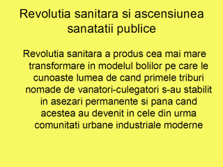 Revolutia sanitara a secolului 19 a aparut in urma descoperirii lui Snow, confirmata apoi de munca altora: William Farr, medic si statistician, primul compilator al rezumatelor in noul creat birou al Registraturii Generale Engleze; bacteriologii Louis Pasteur si Robert Koch; patologul Rudolph Virchow; reformatorii sociali si primii specialisti in sanatate publica Edwin Chadwick, Lemuel Shattuck, John Simon, urmati curand de altii. Asezarile umane au reprezentat nucleul civilizatiei, dar in absenta unei igiene si sanitatii adecvate, acestea au constituit zone ideale pentru poluare si boli. Orasele secolului 19 reprezentau locuri periculoase cu numeroase boli si morti premature. Mai mult de un sfert dintre bebelusii nascuti vii mureau in primul an, iar jumatate mureau inainte de a ajunge la varsta procrearii. Mureau din cauza unor infectii gastrointestinale si respiratorii: holera, febra tifoida, diareea copilului, difterie, crup difteric, pojar, pneumonie, tuberculoza. Autorul diapozitivului: John Last, Canada http://www.pitt.edu/~super1/lecture/lec2561.htm *Nota: revolutia sanitara se refera la modificarile in practicile sanatatii publice care au avut loc in America de Nord si Europa la sfarsitul secolului 19. |