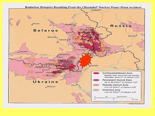 Cel mai mare accident nuclear a avut loc la centrala nucleara de la Cernobal (langa Pripjat, Ucraina) in data de 26 Aprilie 1986. Mai mult de 600.000 de oameni au participat la proiectele de curatare a zonei, dintre care 200.000 erau ucrainieni. Lucrarile au durat pana in 1990. Contaminarea radioactiva s-a intins pe tot teritoriul Ucrainei, a Bielorusiei si Rusiei. Nivelul de contaminare este prezentat pe harta din stanga. Exista niveluri mari de depuneri de Cs-137 in jurul Cernobalului. In ciuda diverselor succese ale revolutiei sanitare, sanatatea mediului nostru inconjurator reprezinta inca un domeniu major de preocupare. Accidentul centralei nucleare de la Cernobal a reamintit tuturor cat de importanta este prevenirea poluarii mediului inconjurator precum si alte amenintari cauzate de om. Efectele radiatiilor asupra sanatatii si activitatile de preventie secundara pentru cei care au fost expusi reprezinta o preocupare majora pentru specialistii in sanatate publica din Ucraina si din alte regiuni. Autorul diapozitivului: Boris Ledoshchuk, MD, PhD, Ucraina http://www.pitt.edu/~super1/lecture/lec2731/001.htm |