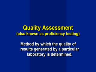 | Quality Assessment is carried out to determine the quality of overall results generated by a particular laboratory. The use of Quality Assessment should check that samples are being handled correctly, results are being appropriately recorded and that assays are performing and being performed in an accurate, efficient and reproducible manner. |