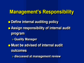 aware of the program and its objectives. Management must develop a policy on internal auditing which is included in the quality manual and is communicated to all staff. Management must designate a staff member, usually the Quality Manager, responsibility to establish and implement the program. Management will determine how and when they are advised of the outcomes of the audit program. Possibly the best way to ensure audit reports are reviewed by management is by including them as an agenda item in the management review meetings. |