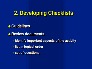 throughout the audit The checklist is a guideline which will lead the auditor though the audit in a logical manner and act as a prompt, reminding the auditor to ask questions, check documents and records. To develop a checklist the documents must be reviewed to identify the important aspects of the activity i.e. activities which must be conducted to meet the requirements of the standard or the documented system. List these activities in a logical order. The checklist will form the basis of the questions the auditor will ask during the audit. The activities may be listed on the checklist in the form of questions which will be asked directly to the auditee, or the checklist can include notes in point form from which the auditor will structure audit questions. |