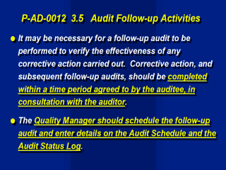 program. The sections highlighted in clause 3.5 are activities which should be investigated during the audit. These activities are ‘auditable’ as the procedure states that they should or must be implemented. A checklist is presented on the next page which is developed from clause 3.5. This checklist would be used by an auditor to audit the internal audit program. |