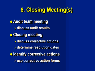 should meet after the audit to consolidate audit findings. The auditee/s and the auditor/s meet at a closing meeting where the auditor briefs the auditee on findings identified during the audit. All non-conformances raised, appropriate responses and time frames are discussed with the auditee. Non-conformances are identified on Corrective Action Report forms (CARs). CARs are multi-purpose forms which record the non-conformance, the agreed corrective action and the resolution. In collaboration with the auditee the auditor suggests a resolution and determines an expected completion date. |