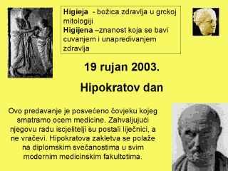 Kratka Hipokratova biografija Hipokrat (460-377? p.n.e.), izuzetni grčki medicinski pisac. O njegovom životu zna se malo činjenica osim da je bio liječnik na otoku Kosu, da je pripadao najintelektualnijem periodu grčkoga života, i da je osobno bio posve slobodan od praznovjerja. Pripisuje mu se preko osamdeset rasprava, no danas se smatra da su neke od njih napisali drugi koji su posudili njegovo ime i ugled. Njegova sabrana djela čine deset svezaka, enciklopediju medicine i kirurgije, kako se to u njegovo vrijeme nazivalo. Hipokrat je nazvan ocem znanstvene medicine. Nije vjerovao u čudesne bolesti niti izlječenja. Naučavao je da je ispravna prehrana neophodna za zdravlje, te da klima ima dubok utjecaj i na tijelo i na duh. Umro je u Tesaliji u dubokoj starosti. http://www.sacklunch.net/biography/H/Hipokrat.html U grčkoj se 19. rujan slavi kao Hipokratov dan. Predlažemo da se Hipokratov dan slavi u cijelom svijetu kao proslava prevencije, Svjetski dan prevencije, kad ćemo zajedno raditi na prevenciji bolesti. Dana 19. rujna 2003. želimo "vjenčati" Hipokratove medicinske koncepte i preventivne koncepte Higijeje, grčke božice zdravlja. Higieja je božica dobrog zdravlja u pratnji svog oca Asklepija, a također i Afrodite koja je predstavljala prevenciju bolesti. "Zajednica" Hipokrata i Higieje može također predstavljatii dva oblika energije, Yang i Yin. Za dodatne informacije o Hipokratu posjetite: http://www.allsis.com/Science/Hipokratbiog_rtb_gn.htm Ovaj slajd napravio je tim Global Health Network Supercourse |
