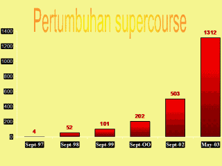 Supercourse sudah berhasil menghimpun ribuan materi kuliah penting yang berasal dari seluruh staf akademik di dunia. Semuanya berjumlah 1200 materi kuliah yang dapat diakses melalui supercourse. Jaringan ini didukung oleh lebih dari 10,000 staf Fakultas dari 152 negara. Anda bisa menghubungi sekretariat Supercourse di Pittburg University melalui: Super1@pitt.edu jika anda ingin mendapat CD kuliah supercourse secara gratis. CD ini berisi 1038 materi kuliah tentang pencegahan dan Public health. |