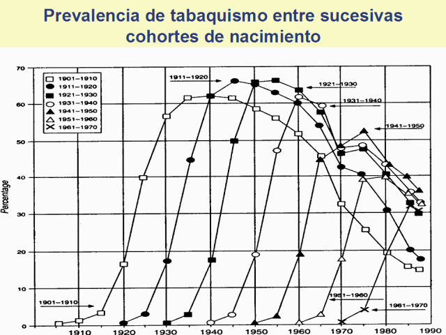 Cambios en la prevalencia de tabaquismo entre sucesivas cohortes de nacimiento de homres, Estados Unidos, 1900-1987. Fuente: Reprinted from Strategies To Control Tobacco Use in the United States: A Blueprint for Public Health Action in the 1990s. p. 82, National Cancer Institute, National Institutes of Health, Publication No. 92-3316, 1992.