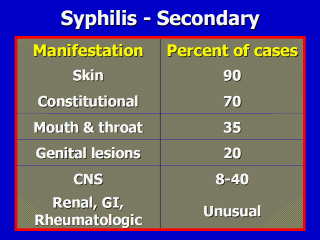 | Secondary syphilis is truly a systemic disease. While dermatologic findings dominate the picture, the majority of patients show systemic symptoms. In some studies as many as 40% had neurologic symptoms, and although renal, gastrointestinal, and rheumatologic findings are less common, their occurrence contributes to the protean presentations seen with secondary syphilis. |