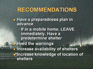 and business should have a tornado safety plan in advance The data shows that television broadcasts are very effective in reaching a majority of the population in the path of the tornado. It was reported that some people had as much as 30 minutes advanced warning. However, individuals should heed the warnings. We can estimate that about 37% of persons in the OCMSA have access to or knowledge of the locations of shelters. Since we spend a lot of time in tornado alley, we should have a goal to increase this proportion. Also, since we know that most people will take shelter in their homes if not in a storm shelter, we could probably improve building codes to address this natural disaster potential, similar to the way that California addresses the potential for earthquakes in their building codes. |