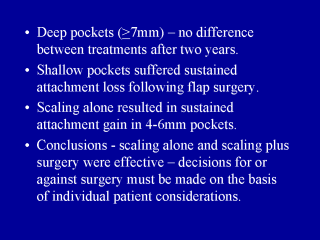 4) Shallow pockets suffered sustained attachment loss following flap surgery. 5) Scaling alone resulted in sustained attachment gain in 4-6mm pockets. The conclusions here are interesting. If there are no differences between effectiveness of treatment procedures and some clear advantages to scaling alone, what patient would give informed consent for surgery if they could likely do just as well without it. Surgery is more painful, more expensive and more debilitating causing root sensitivity, clinically long crowns, etc. Though it is contradictory to the scientific evidence, periodontal surgery is still being prescribed for large percentages of patients when scaling alone will deliver nearly equivalent results as scaling with surgery. Just a word about our medico legal obligations here. A large majority of my patients who have been attracted to our office by the possibility that they do not need periodontal surgery have stated they were never informed by their previous dentist(s) that there were alternatives to the surgery. Usually they were told they needed the surgery. It is part of the civil law governing medical practice in the USA that patients must be informed of risks, benefits and alternatives to any treatment proposed to satisfy informed consent. However, it appears that this is rarely satisfied prior to periodontal treatment. Please note that the results reported by Dr Ramfjord and Nissle were indeed