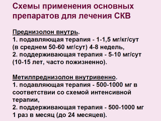 Циклофосфамид внутривенно. 1. подавляющая терапия - 500 мг 1 раз в неделю 4 недели или 1000 мг 1-2 раза при комбинированной терапии или 200 мг через день 10 раз (до суммарной дозы 2000 мг в месяц). 2. поддерживающая терапия - 1000 мг 1 раз в месяц 6 мес., затем 200 мг 1 раз в неделю с увеличением интервала между инъекциями (до 5 лет). Азатиоприн. 1. подавляющая терапия - 100-150 мг/сут, 2. поддерживающая терапия - 50-100 мг/сут (до 5 лет). Гидроксихлорохин. 1. подавляющая терапия - 600 мг/сут, 2. поддерживающая терапия - 200-400 мг/сут (длительно, нередко пожизненно) |