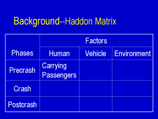 To better understand the role of carrying passengers in motor vehicle crash injuries, the Haddon matrix would be a good tool to use. A brief description of the Haddon matrix can be found in the Injury Fact