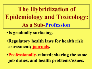 As pointed out in earlier slides, compliance with health laws often requires the performance of health risk assessment, which typically cannot be made with epidemiologic or toxicologic studies alone. It is also important to note that those health issues and concerns requiring the most public attention often are not purely academic, medical, or clinical, but rather environmental, in nature. To put it another way, the hybridization of epidemiology and toxicology is gradually surfacing, only simply because there is a need for epidemiologists and toxicologists to work in concert with one another in order to effectively and efficiently cope with public demands coming from all sectors of a population.