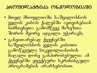 1998 wlis monacemebiT msoflioSi yovelwliurad aRiniSneba saSvilosnos yelis kibos 471 000-ze meti axali SemTxveva. SemTxvevebis umravlesoba modis ganviTarebad qveynebze. am daavadebiT gamowveuli maRali sikvdilianoba ganviTarebad qveynebSi ganpirobebulia efeqturi skrininguli programebis ararsebobiT. am programebis mizania prekanceruli mdgomareobebis gamovlena da maTi drouli mkurnaloba kibos invaziuri formis ganviTarebamde. efeqtur profilaqtikur programebs am qronikuli daavadebis SemTxvevaSi SeuZliaT sikvdilianobis maCveneblis mkveTri Semcireba.