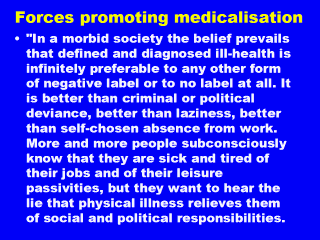 They want their doctor to act as lawyer and priest. As a lawyer, the doctor exempts the patient from his normal duties and enables him to cash in on the insurance fund he was forced to build. As a priest, he becomes the patient's accomplice in creating the myth that he is an innocent victim of biological mechanisms rather than lazy, greedy, or envious deserter of a social struggle over the tools of production. Social life becomes a giving and receiving of therapy: medical, psychiatric, pedagogic, or geriatric. Claiming access to treatment becomes a political duty, and medical certification a powerful device for social control." Ivan Illich