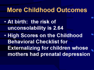 symptoms scale could not be consoled and cried excessively. Prenatal depressive symptoms are also linked to abnormal scores for Externalizing and Total Problems Scores on the Childhood Behavioral Checklist. |