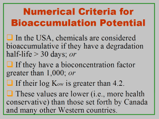 in performing risk assessments for pollutants of ecological concerns. Once a pollutant is suspected to be a potential bioaccumulant, its concentrations will be measured in ambient media (usually water) and estimated in relevant organism tissues. The bioaccumulation potential for this pollutant is then qualified by a bioconcentration factor (BCF) value, which is usually measured as the ratio of the chemical’s residues in aquatic organisms (usually fish) to its level in ambient water (Code of Federal Regulations, 2003). In the USA, pollutants are considered bioaccumulative if they have a degradation half-life > 30 days, a BCF > 1,000, or a log Kow value > 4.2 (Corl, 2001; U.S. EPA, 1999, 2000). These values are below those adopted by Canada (CEPA, 1999) and many other Western countries. Half-life is a measure of the time it takes for half of the material’s initial amount to be degraded. The chemical property Kow is an octanol-water partition coefficient, which is the ratio of a chemical’s concentration in the octanol phase to its concentration in the water phase quantifying the potential for partitioning into organic matter. Kow is inversely related to the compound’s water solubility; it represents the compound’s tendency to partition itself between an organic phase (e.g., a fish, a soil) and an aqueous phase. Its logarithmic form (log Kow) is used in models to estimate bioaccumulation factors in fish, plants, etc. |