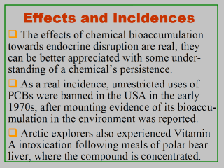 happening. For example, PCBs were once widely used in heat-transfer and hydraulic systems, and in products such as plasticizers, rubbers, lubricant inks, adhesives, waxes, fire retardants, paint additives, and dielectric fluids. In the USA, unrestricted uses of PCBs were initially banned in the early 1970s, after mounting evidence of its persistence and bioaccumulation in the environment was reported (Madsen et al., 2003). The most dreadful effect of chemical bioaccumulation is the fact that some substances can be accumulated to toxic levels in organisms when otherwise they are present below these levels. The classic case is the Vitamin A that becomes concentrated in polar bear livers. Vitamin A is a family of fat-soluble compounds, including the steroid hormone retinoic acid. Polar bears are pure carnivores that feed on other fish-eating carnivores such as seals. As they are at the top of the food chain, polar bears often accumulate extremely large amounts of Vitamin A in their livers, as many as 3,000 times the recommended daily allowance. It is a well-known case to many nutritionists that in the past, some Arctic explorers had experienced Vitamin A poisoning following meals of polar bear liver (e.g., Roels and Lui, 1973). Go to Part III of this lecture