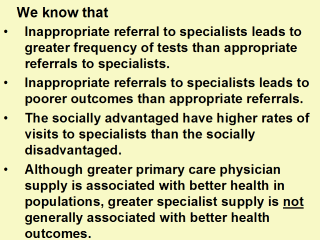 | Sources: van Doorslaer E, Koolman X, Jones AM. Explaining income-related inequalities in doctor utilisation in Europe. Health Econ 2004; 13(7):629-647. Starfield B, Shi L, Grover A, Macinko J. The role of evidence in physician workforce policy. Submitted for publication 2004. |