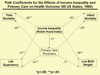 reduces the adverse impact of social inequality. In a path analysis taking income inequality into account, the supply of primary care physicians in the 50 US states is significantly associated with less infant mortality, lower total mortality, and higher life expectancy. (In contrast to international comparisons, there is no relationship with low birth weight, probably because of the many sociodemographic influences and poor maternal health care in vulnerable populations in the US. ) Source: Shi L, Starfield B, Kennedy BP, Kawachi I. Income inequality, primary care, and health indicators. J Fam Pract 1999; 48(4):275-284. |