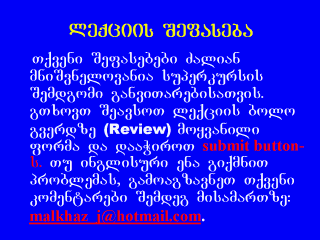 gTxovT gamogvigzavnoT zogadi da konkretuli xasiaTis komentarebi leqciis Sesaxeb. aseve mogvawodeT im saitebis misamarTebi, romelTac am mocemul leqciasTan aqvT Sinaarsobrivi kavSiri.