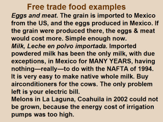 The importation of milk goats to Mexico in the 60s-70s ended in a rather large bar-b-q in 1994 when subsidies were withdrawn. Lack of rainfall and the corynebacterial disease caseous lymphadenitis are the causes of complete failure. Mexico has meat goats as cabrito al pastor, not ! milk goats. The fantastic import idea was that goats could compete with Wisconsin dairy cattle. Milk goats are ANTIECONOMIC. Wintertime tomatoes remain a profitable crop. Tropical crops including coffee remain highly viable, although the competition among countries growing sugar is high. For years these lands of fast runoff silted rivers have been cleaned of nitrogen and phosphate without fertilizer replacement. What is left to "exploit?" The remaining forests. Nomads scrape out shortlived farms on the one hand, and on the other are we face the multinational loggers. The value in clearing the land is some nitrogen for a year or 2, then infertility again. Corn, sorghum or another 3-month crop need most water when they bloom and seed, booting out. Many a crop will die "on the vine." |