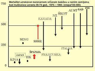 Mortalitet uzrokovan koronarnom srčanom bolešću u raznim zemljama, u muškaraca uzrasta 35-74 god., 1970. i 1993. (stopa/100.000) Ovaj slajd pokazuje da su zemlje bivšeg Sovjetskog saveza, za razliku od mnogih drugih, suočene s porastom mortaliteta od koronarne srčane bolesti. Najvažniji uzrok te tendencije je slom javnozdravstvenog sistema u bivšem SSSR-u. Izvor: NIH, SAD AUST = Australija, FIN = Finska, HK = Hong Kong, NZ = Novi Zeland, SING = Singapur, ŠKOT = Škotska http://www.pitt.edu/~super1/lecture/lec4091/006.htm Dr. Ueshima, profesor i šef Katedre, Odeljenje zdravstvenih nauka, Shiga University Medical Science, Japan |