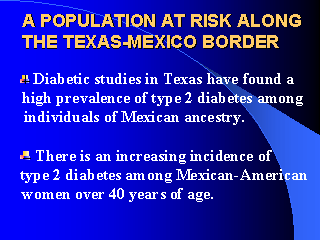 However, to address the need for a culturally sensitive network of interdisciplinary professional health care providers, I eventually plan to conduct an in-depth literature review, in both English and Spanish, of field-investigations that describe epidemiologic studies, community intervention programs, barriers to care, patient education, and other social and demographic variables related to Type 2 Diabetes Mellitus in the U.S.-Mexico border population, in particular the communities along the California-Mexico border.
