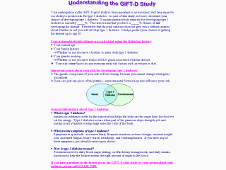 Your participation in the GIFT-D pilot study is very important to us because it will help improve our ability to predict risk for type 1 diabetes. As part of this study, we have calculated your chance of developing type 1 diabetes. Your personalized risk estimate for developing type 1 diabetes is currently _____%. This also means that you have a _____% chance of not developing the disease. Remember that this risk estimate does not give you a definite answer about whether or not you will develop type 1 diabetes. It helps predict your chance of getting the disease up to age 30. Your personalized risk estimate was calculated using the following factors: · Your current age · Your family history ÞWhether or not you have a brother or sister with type 1 diabetes · Your genetic makeup ÞWhether or not you have forms of HLA genes associated with the disease v Your risk is not based on any environmental risk factors such as viruses or diet. Important points about your risk for developing type 1 diabetes: Ø The genetic component of your risk will not change because you cannot change what genes you inherit. Ø Genes are just one piece of the puzzle—environmental factors may also influence your risk.