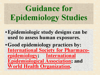 1996; Lilienfeld and Stolley, 1994; Rothman and Sander, 1998; Szklo and Nieto, 2000). Both the International Society for Pharmacoepidemiology (ISPE, 1996) and the International Epidemiological Association (IEA, 2000) have provided sound guidance for good epidemiology practices. The guidance document provided by ISPE is more on practices for drug, device, and vaccine research, whereas the IEA guidance has a focus on competence criteria for use to qualify a well-trained epidemiologist. To date, World Health Organization (WHO, 1983) has provided the most comprehensive guidance document for use of epidemiologic studies within the context of health risk assessment (RA). This WHO document, entitled “Guidelines on Studies in Environmental Epidemiology”, was coincidentally published in the year the RA scheme was first formulated by the National Research Council (1983). The WHO document covered not only the various basic epidemiologic study designs mentioned above, but also such topics as assessment of exposure and adverse health effects. As discussed in Lecture 3, human exposure assessment and hazard identification are two of the four key components of RA. |