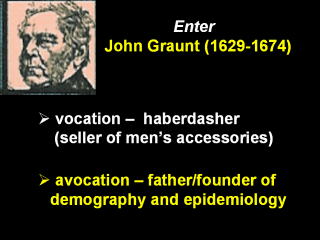 | Fast forwarding, we would not be in error in acknowledging John Graunt as the founder of the kindred disciplines of epidemiology and demography. |