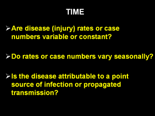 Time is important in characterizing disease or injury occurrence, if incidence rates or case numbers markedly increase or decrease, if there is a seasonal effect, and for determining whether a communicable disease is attributable to a point-source infection, a continuing common source infection, or an intermittent exposure.