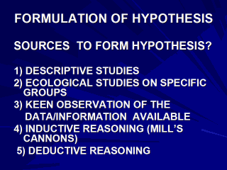 This is the very usual way of getting ideas about hypothesis formation. If one thinks and analyses why a particular disease has occurred at a particular time or place and why it has affected people of certain ages and of certain groups only, then a number of hypotheses will emerge. Ecological studies, the studies conducted on specific groups with specific characteristics, also provide useful information for forming the hypothesis. Examples are that Cancer cervix is rare in Jewish women due to male circumcision and Sickle cell disease is more seen in Indian tribes. |