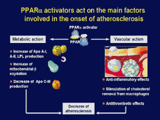 | PPARalpha activators decrease atherogenesis by improving plasma lipid metabolism (decrease in triglyceride rich atherogenic lipoprotein and increase in anti-atherogenic HDL particles). PPARalpha activation also decreases atherogenesis by improving the vascular wall biology (decrease in the cholesterol content of the vascular wall, anti inflammatory and anti thrombotic effects). |
