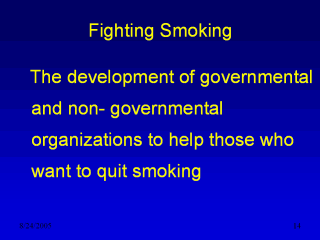 established a smoking cessation clinic. This clinic’s functions are: - Encouraging smokers to quit smoking - Providing smokers with nicotine alternatives (such as nicotine gum and nicotine filters) that aid smokers quit smoking. - Form support groups of ex-smokers - Provide health education about consequences of smoking In addition, the Jordanian National Anti-Smoking Society, which is a non-governmental organization, is also complementing the Ministry of Health in campaigning against smoking especially at the primary level of prevention |