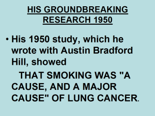 dangers of tobacco. During groundbreaking research, he and colleagues interviewed some 700 lung cancer patients to establish a common thread. The findings were published in 1950 and confirmed in a paper in 1954. |