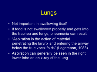 | Again, the lungs are out of the realm of the speech-language pathologist and are usually monitored by a pulmonologist or other specialist, but it is important to know how disordered swallowing can cause life or death situations in the lungs, compromising the pulmonary status of the child. |