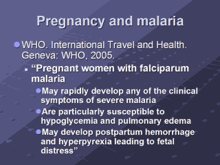 | WHO (2005) also indicates that "pregnant women with falciparum malaria may rapidly develop any of the clinical symptoms of severe malaria, are particularly susceptible to hypoglycemia and pulmonary edema, and may develop postpartum hemorrhage and hyperpyrexia leading to fetal distress". |