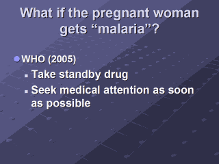 | The WHO (2005) recommends any pregnant woman who gets malaria should take standby drug, if any, and seek medical attention as soon as possible. |