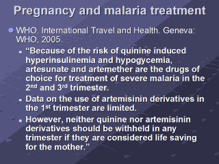| The WHO (2005) gives the following advice: "because of the risk of quinine induced hyperinsulinemia and hypogycemia, artesunate and artemether are the drugs of choice for treatment of severe malaria in the 2nd and 3rd trimester. Data on the use of artemisinin derivatives in the 1st trimester are limited. However, neither quinine nor artemisinin derivatives should be withheld in any trimester if they are considered life saving for the mother." |