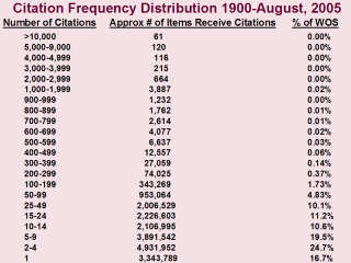 For a more realistic view of citation frequencies, this slide shows that from 1900-2005, about one half of one percent of cited papers were cited over 200 times. Out of about 38 million source items about half were not cited at all. Keep in mind that “items” includes not only substantive articles but also ephemera mentioned earlier. Therefore, these data provide a distorted picture for high impact journals where the number of uncited publications is much smaller.