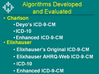 Quan et al. developed ICD-10 codes and enhanced ICD-9-CM codes for the sixteen Charlson comorbidities using Deyo's ICD-9-CM coding. They also developed the ICD-10 and enhanced ICD-9-CM codes for the thirty Elixhauser comorbidities using the original ICD-9-CM and the AHRQ-Web ICD-9-CM. The following slides focus on the development of the ICD-10 codes for both comorbidities. |