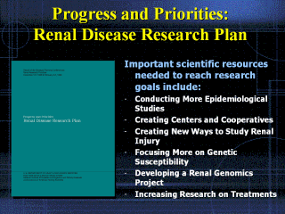 Strategic Planning Conferences on Renal Research Priorities. Participants identified important scientific resources that would be needed to reach research goals, including: · Conducting More Epidemiological Studies; · Creating Centers and Cooperatives; · Creating New Ways to Study Renal Injury; · Focusing More on Genetic Susceptibility; · Developing a Renal Genomics Project; · Increasing Research on Treatments; and · Improving Grant Review at the National Institutes of Health. The full plan is available at http://www.niddk.nih.gov/fund/other/archived-conferences/1999-1997/wholeRDRC.pdf |