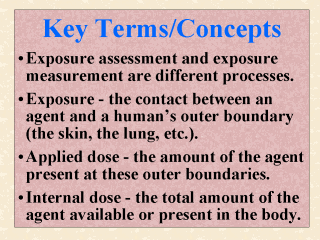 measured. As noted in the U.S. EPA guidelines (Federal Register, 1992), exposure assessment in various forms dates back at least to the early 20th century, particularly in the field of epidemiology and those dealing with occupational exposure. The federal agency further defines exposure as the (physical) contact between a chemical and a human's outer boundary (primarily the skin, the gastrointestinal tract, and the lung). The applied dose, on the other hand, is the amount of a chemical present at one or more of these outer boundaries which typically serve as absorption barriers. Another closely-related term is the internal dose from exposure, which is the amount of a substance that has been absorbed through these barriers, and is available for biological interaction with receptors located in any of the various tissue compartments. HEA is supposed to be as important to some toxicologists as to many epidemiologists. It is a well-known toxicologic concept that the magnitude, the frequency, and the route of dosing all have a significant impact on the nature, the severity, and the potential that an adverse effect is induced. Often times, repeated exposures at lower dosage may lead to the same or other (local or systemic) effects induced by a single acute exposure at higher dosage. |