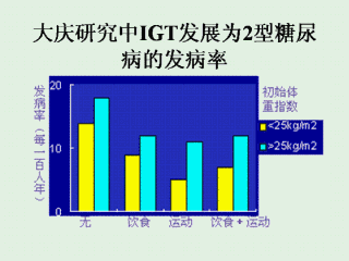 上图显示按照体重指数四组中2型糖尿病的发病率。每个积极干预组的发病率较对照组均有40%降低。每组中体重指数低的糖尿病发病率也低,因此,热量摄入和体力活动与2型糖尿病的发生为因果关系。提示我们,无论在高发病率人群还是低发病率人群,生活方式的改变在预防糖尿病的发生中扮演着重要的作用。相似的实验在美国也在进行,以证明在不同的社会经济和环境状况下同样的干预是否有效。