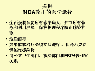 -被美国军队医院感染疾病研究所(USARMIID)和疾病控制中心(CDC)支持和批准。如果一次BW攻击被怀疑或证实,医院人员应该努力得到鉴定制剂和它的传播、感染性质方面的信息,以及BW直接导致的健康结果和明确的处理草案。也应该通知执法官员和当地联邦调查局(FBI)。